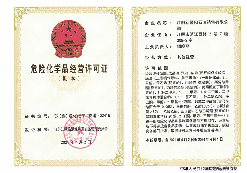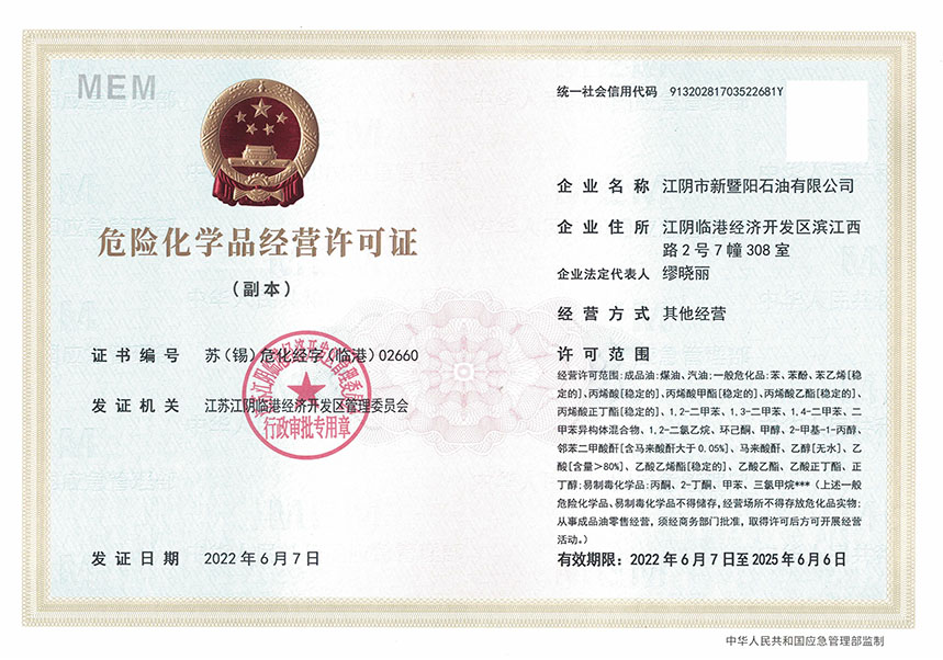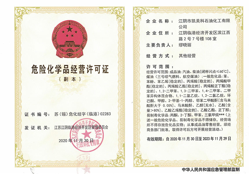 ![]() 江陰市凱美科?;方?jīng)營(yíng)許可證 |